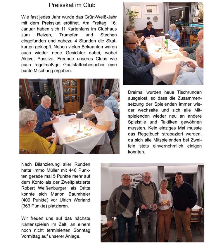 Am Freitag Abend, 21.02.2025 war es wieder so weit: Unser Clubhaus wurde zum Treff unserer Skatspieler. Neben vielen Wiederholungstätern konnten wir hierbei auch zahlreiche Gäste unseres Vereins sowie unserer Vereinsgaststätte La Forchetta begrüßen.